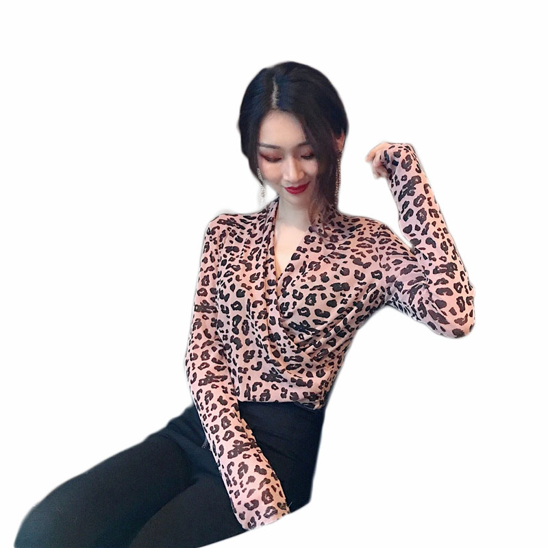 韓版網紅款時尚俏皮豹紋網紗蕾絲修身顯瘦打底長袖交叉領T恤女潮