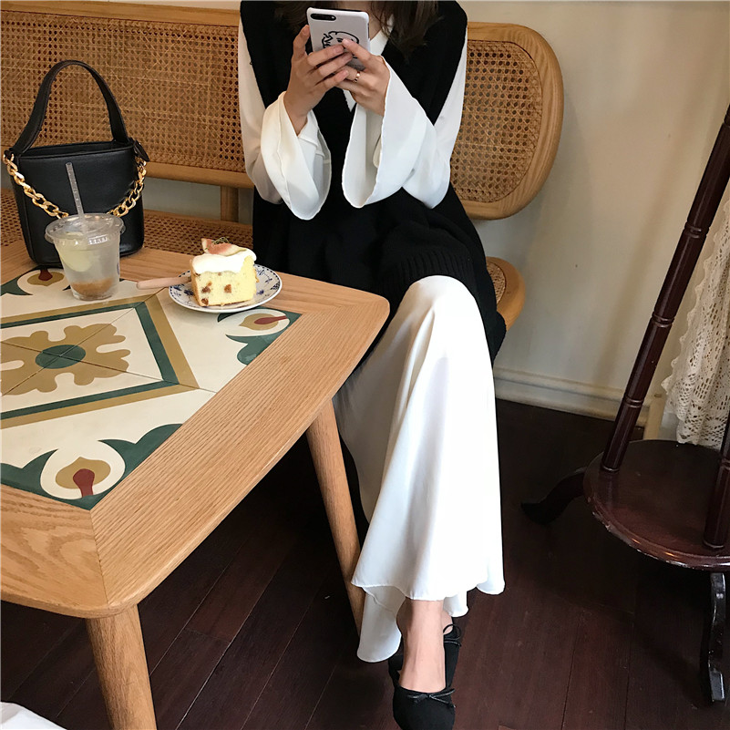 女神套裝秋復古寬松v領毛衣背心馬甲+初戀裙雪紡長袖連衣裙兩件套