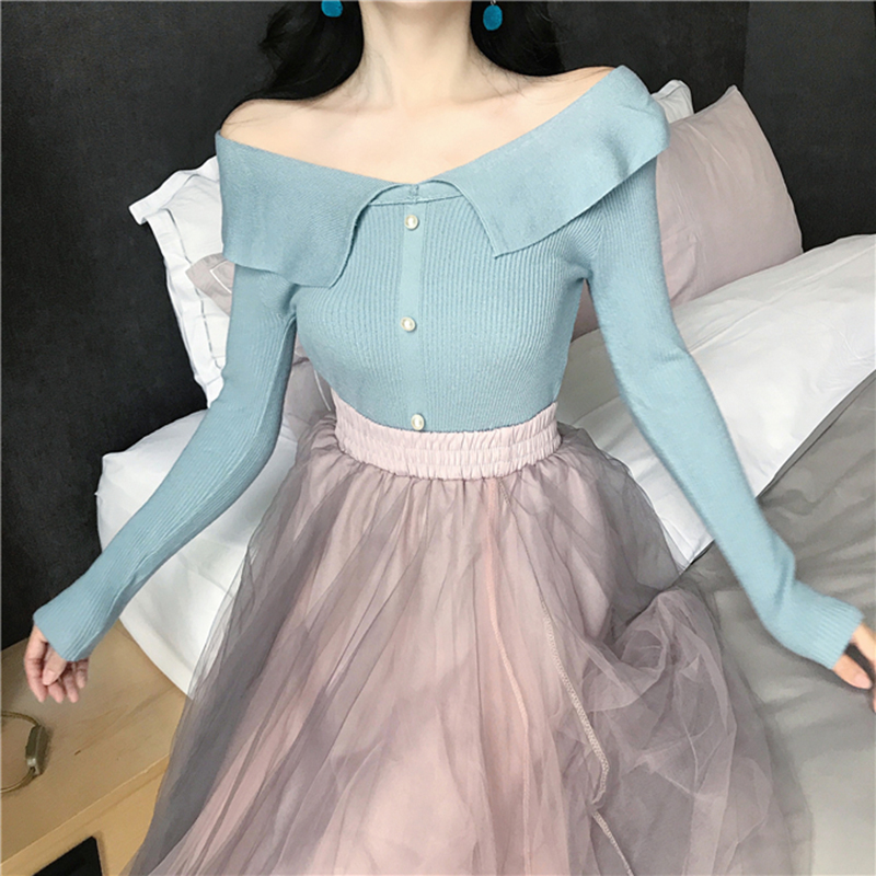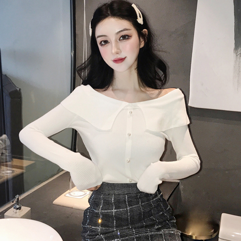 / 一字露肩修身顯瘦打底針織衫女秋冬裝新款學生復古風長袖白色上衣