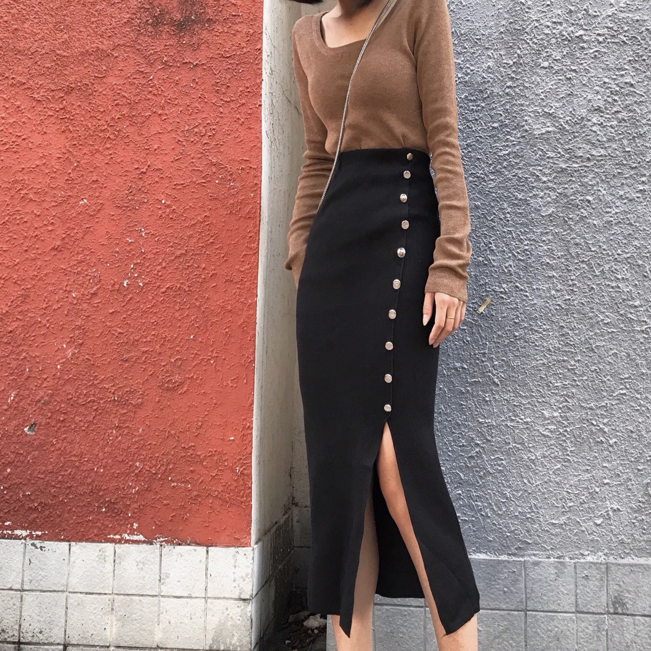 / 半身裙秋女2018新款時尚復古百搭修身顯瘦一排扣針織高腰中長裙潮
