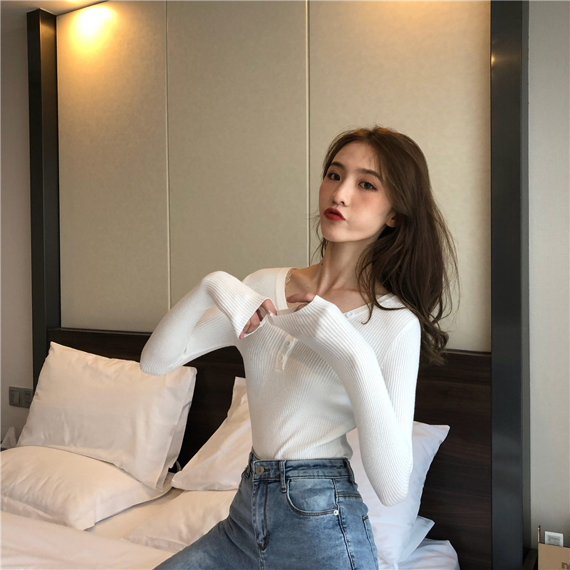 毛衣女2018新款時尚韓版V領純色套頭修身顯瘦紐扣長袖打底衫上衣