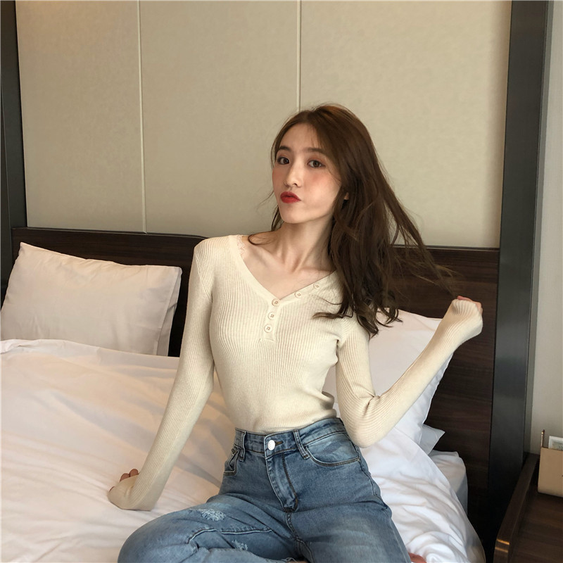 / 毛衣女2018新款時尚韓版V領純色套頭修身顯瘦紐扣長袖打底衫上衣