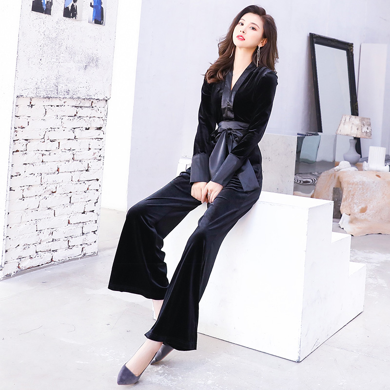 / 絲絨連體褲女2018秋季新款氣質時尚套裝名媛收腰系帶修身連身褲女