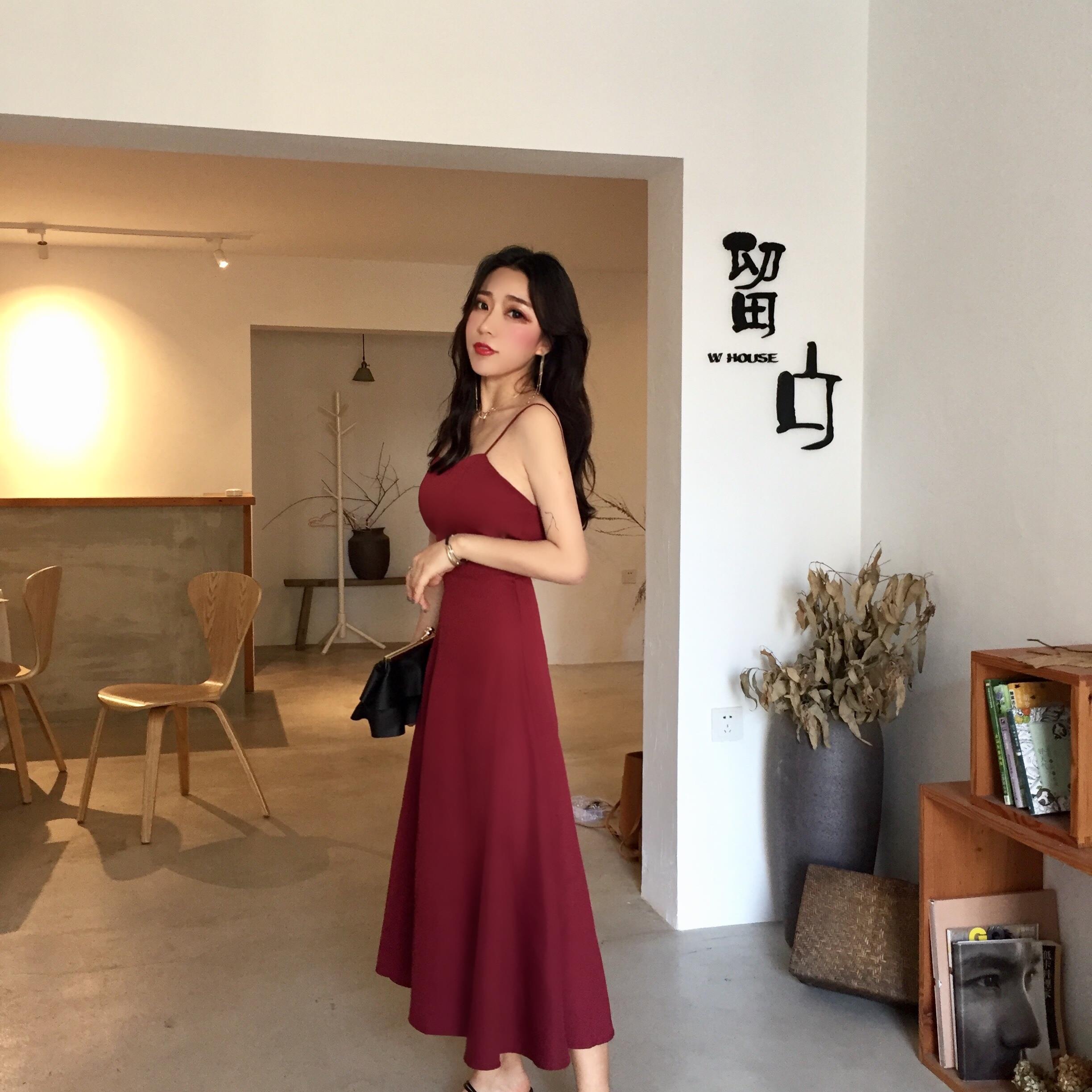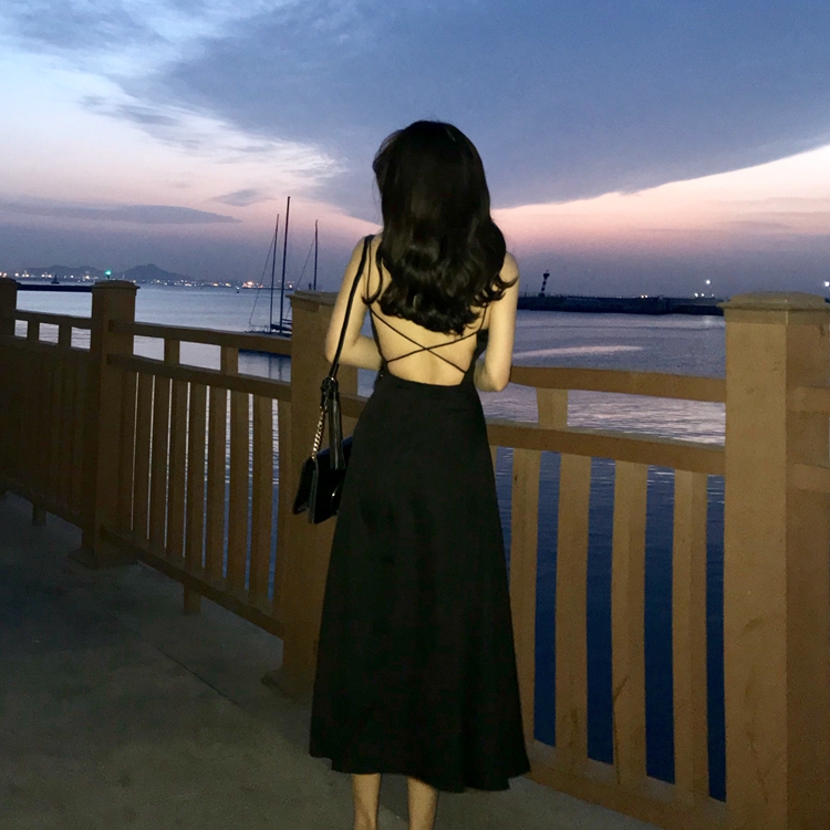 / 新款chic性感露背交叉綁帶修身顯瘦中長款純色時尚吊帶連衣裙女潮