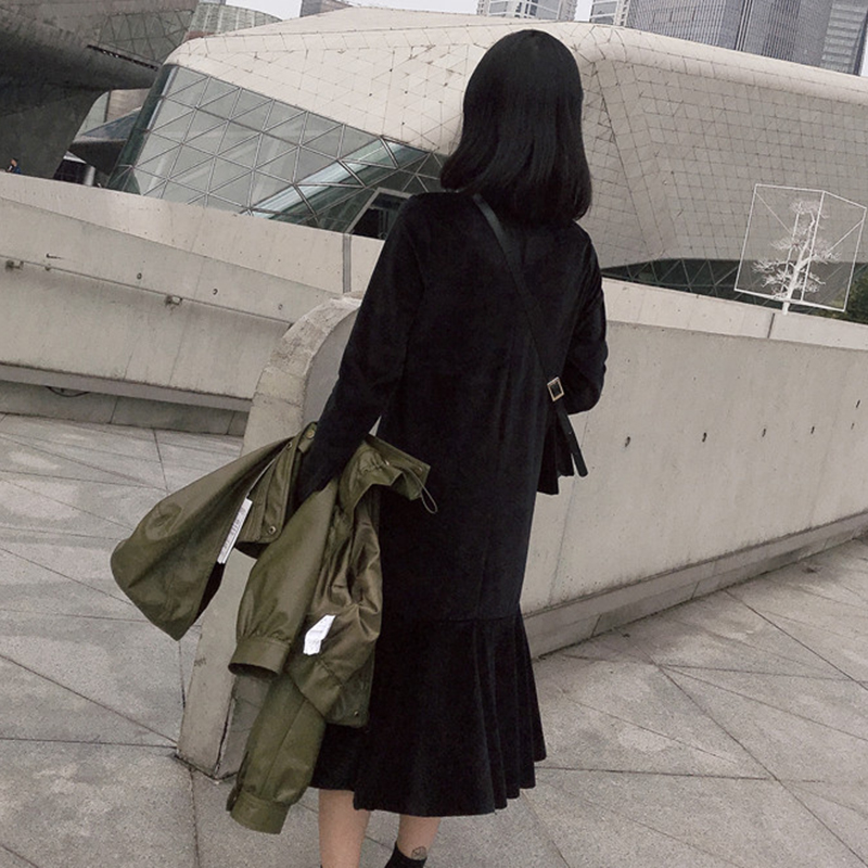 / 氣質絲絨長袖黑裙子秋裝女2018新款時尚半高領中長裙荷葉邊連衣裙