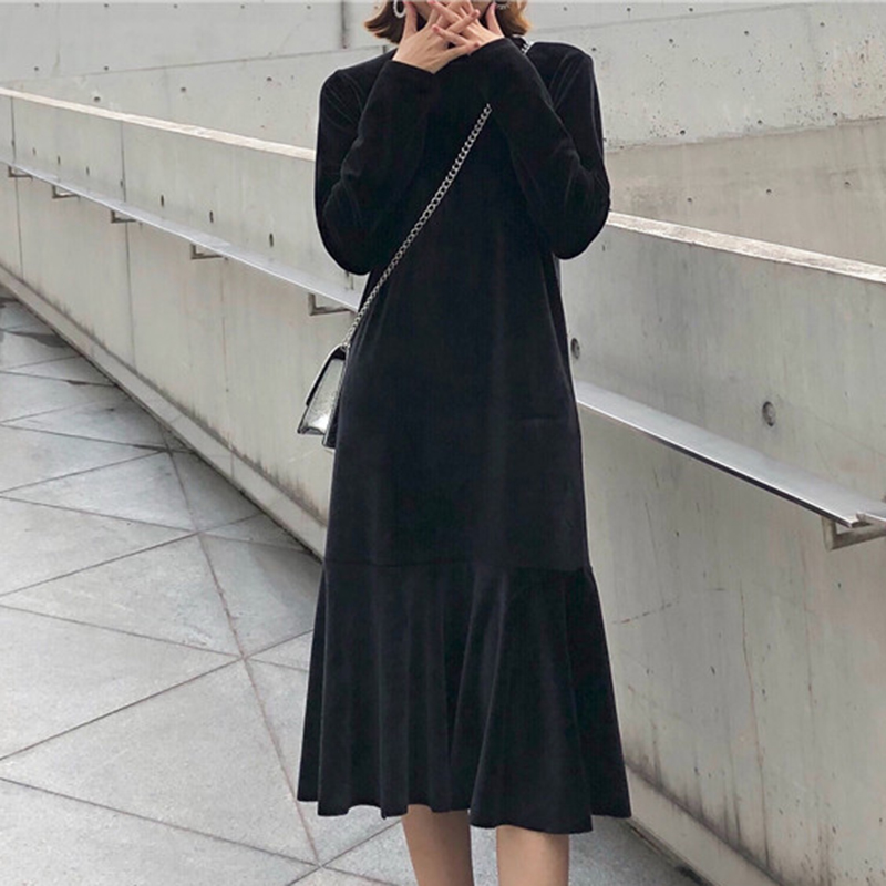 氣質絲絨長袖黑裙子秋裝女2018新款時尚半高領中長裙荷葉邊連衣裙