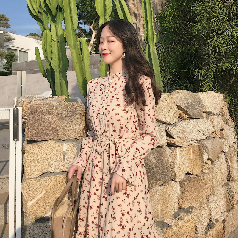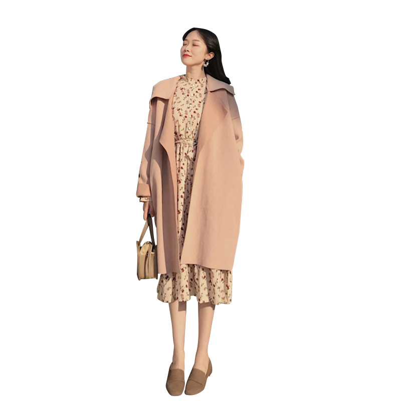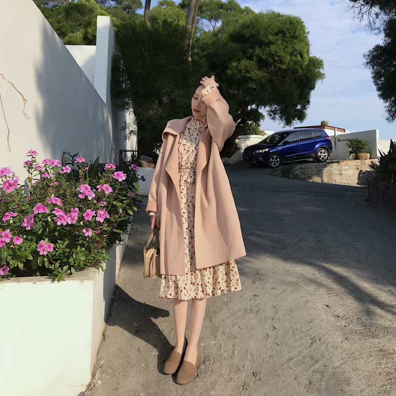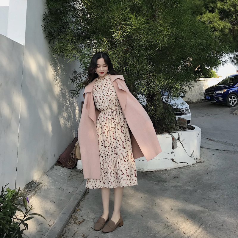 / 秋冬新款韓版chic毛呢外套中長款復古碎花雪紡長袖連衣裙時尚套裝