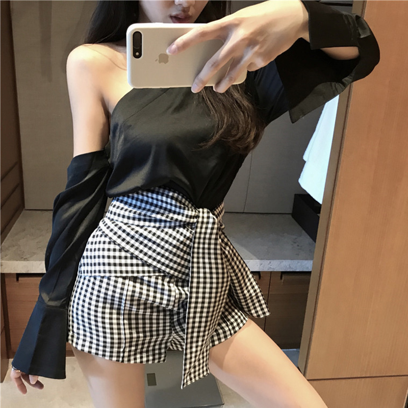 / 早秋女裝新款氣質不規則斜肩長袖襯衣+綁帶高腰格子短褲時尚套裝
