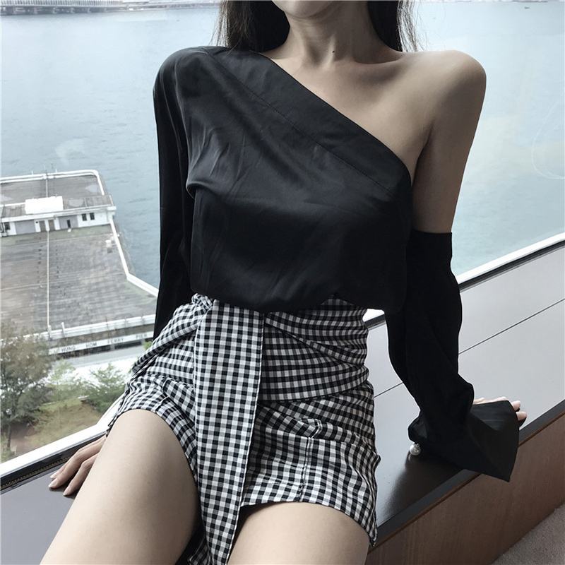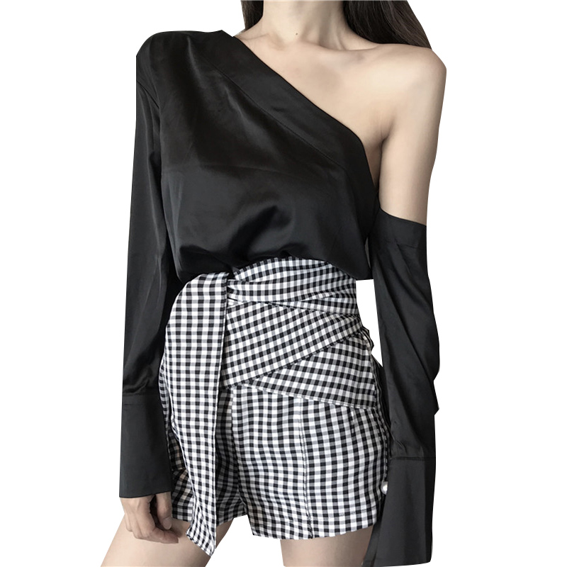 早秋女裝新款氣質不規則斜肩長袖襯衣+綁帶高腰格子短褲時尚套裝