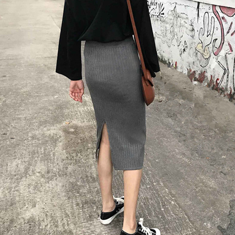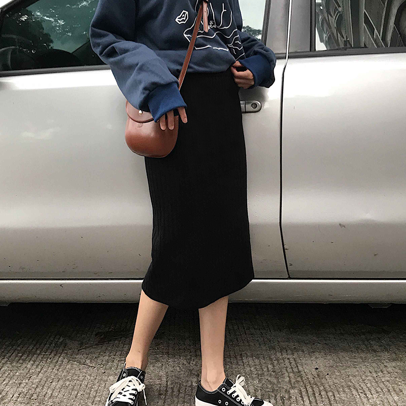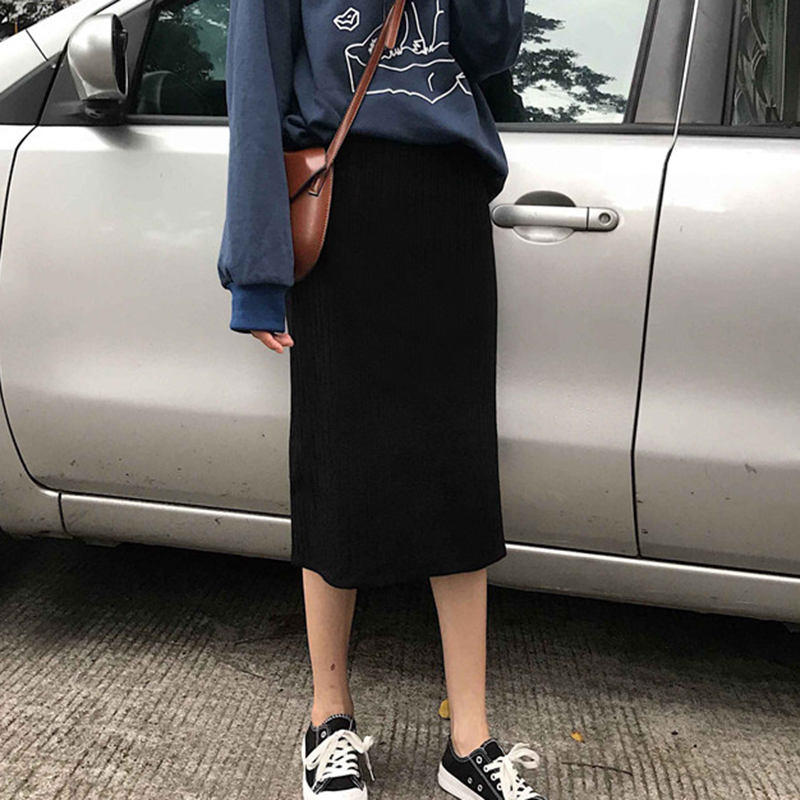 半身裙女秋裝2018新款學生百搭高腰中長裙復古時尚開叉包臀針織裙