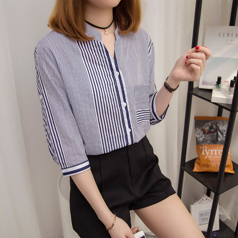 / 條紋襯衫女甜美上衣小清新韓范半袖不規則格子襯衣女chic襯衫外套