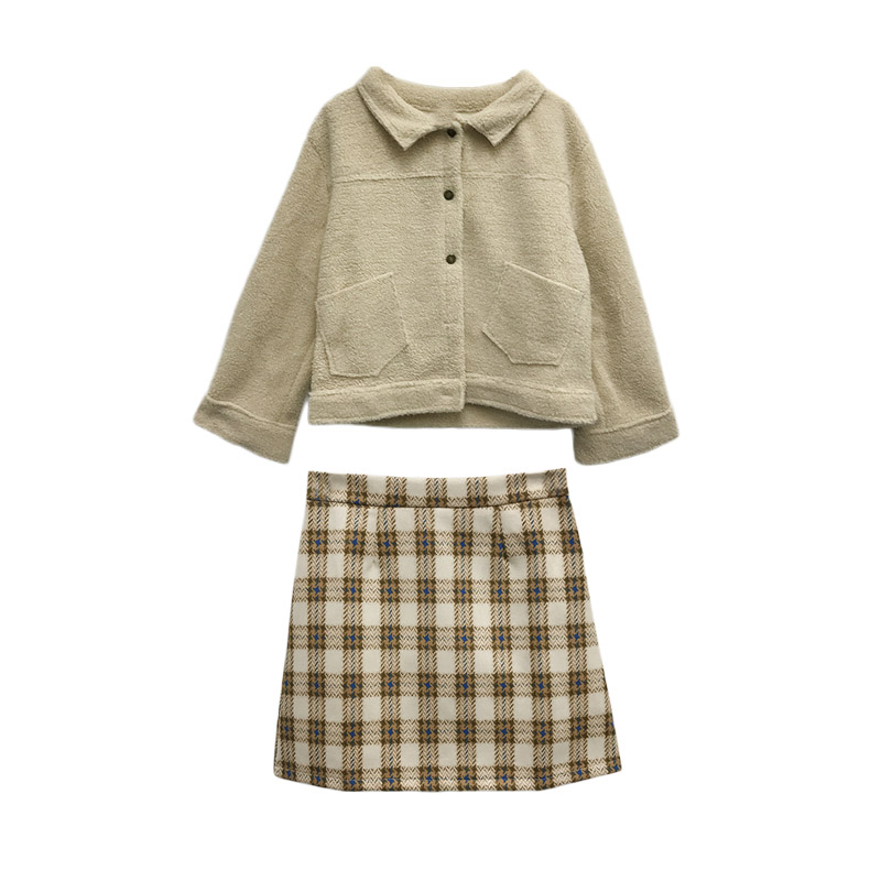 杏色外套|淺卡色外套|咖色 半身裙|灰色半身裙