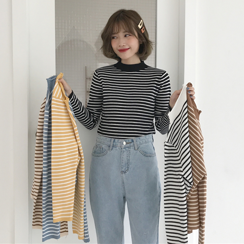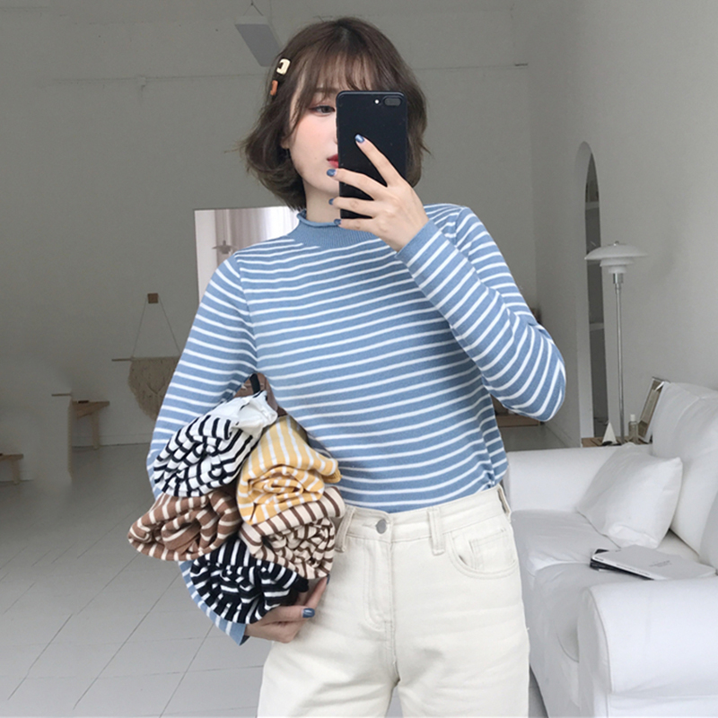 半高領條紋長袖針織衫女秋冬裝2018新款韓版氣質修身外穿打底毛衣