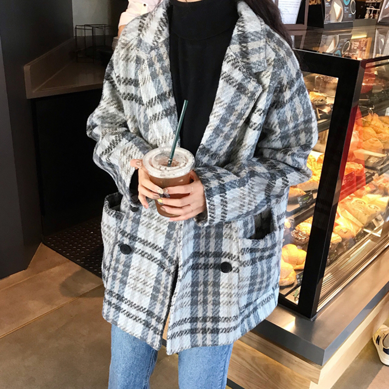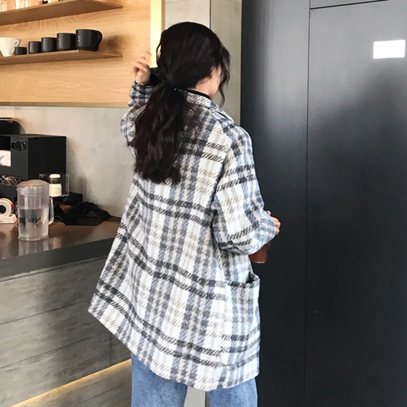 / 2018流行妮子大衣女秋冬裝新款韓版寬松西裝領中長款格子毛呢外套