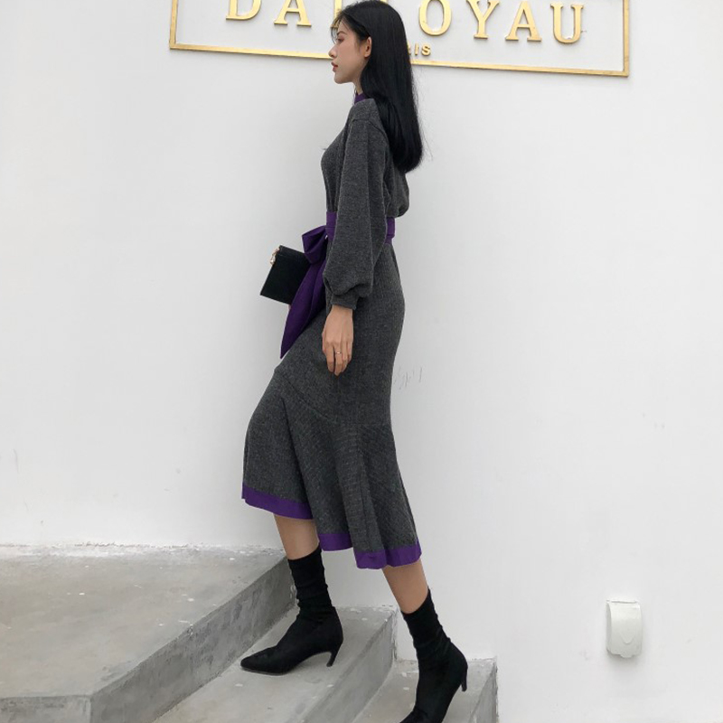 / 氣質收腰顯瘦中長連衣裙子女秋冬裝新款egg時尚拼色A字魚尾桔梗裙
