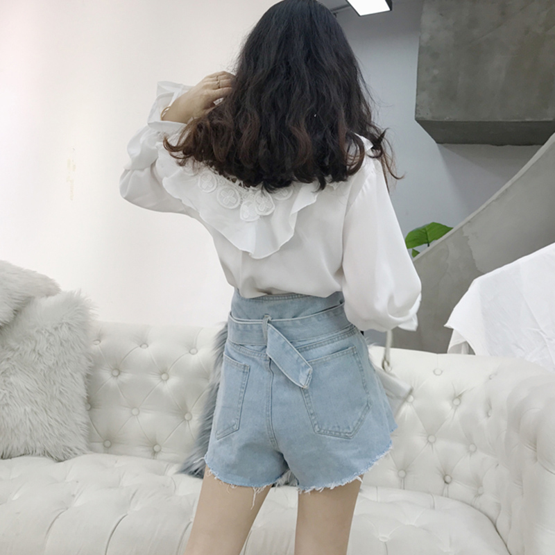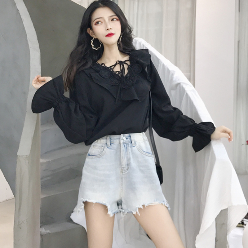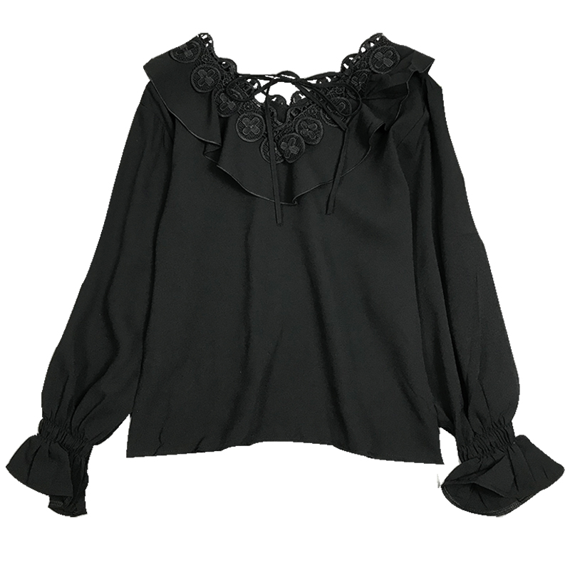 / 早秋新款韓版女裝氣質寬松系帶荷葉邊V領雪紡襯衫刺繡花邊上衣
