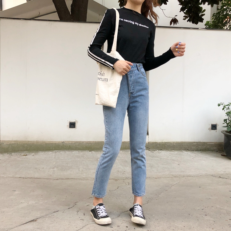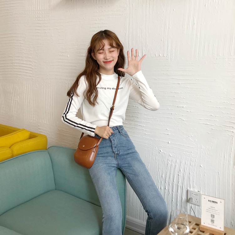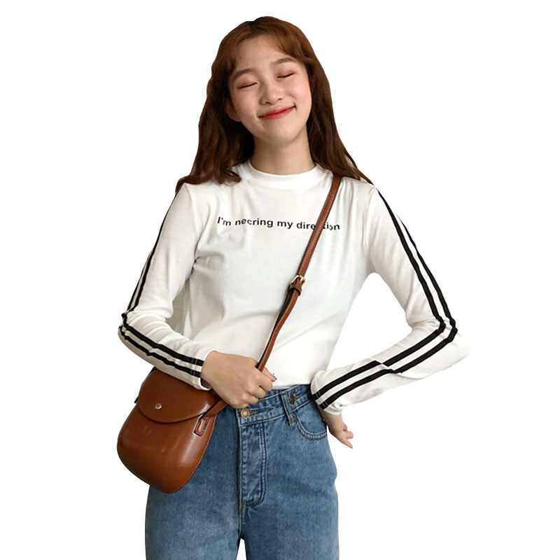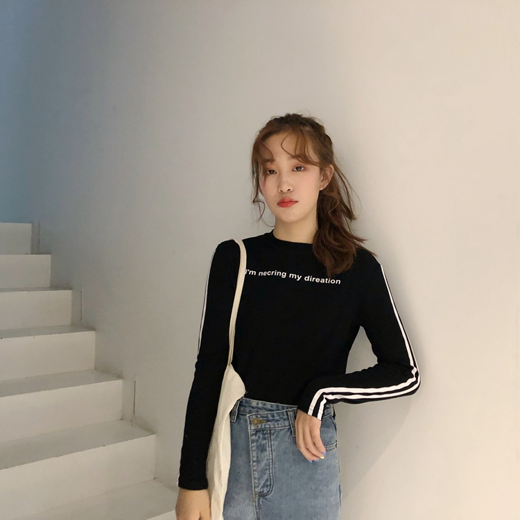 / 秋季女裝韓版氣質修身顯瘦字母圓領條紋長袖打底衫t恤顯瘦上衣潮
