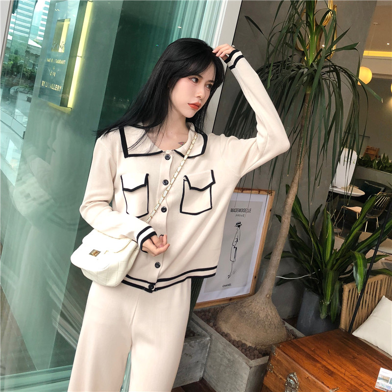 韓范女神套裝秋冬季新款針織顯瘦小香風短款上衣+闊腿長褲兩件套