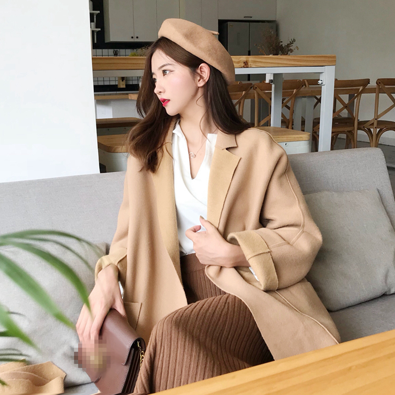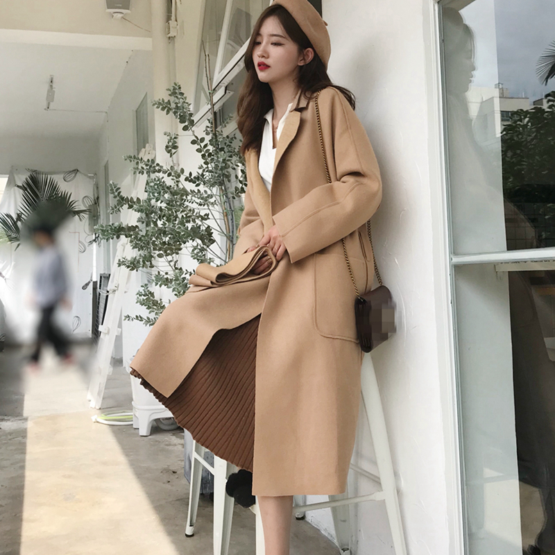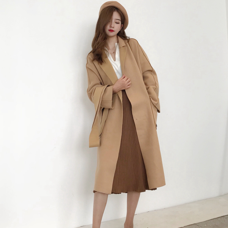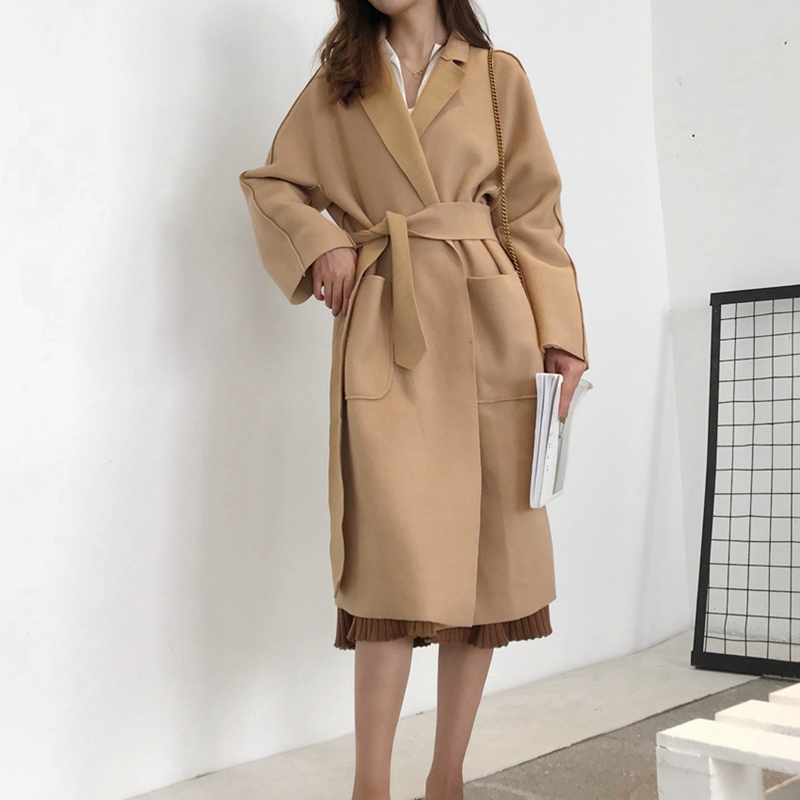 / 外套女秋裝2018新款中長款過膝雙面呢子大衣寬松綁帶收腰毛呢外套