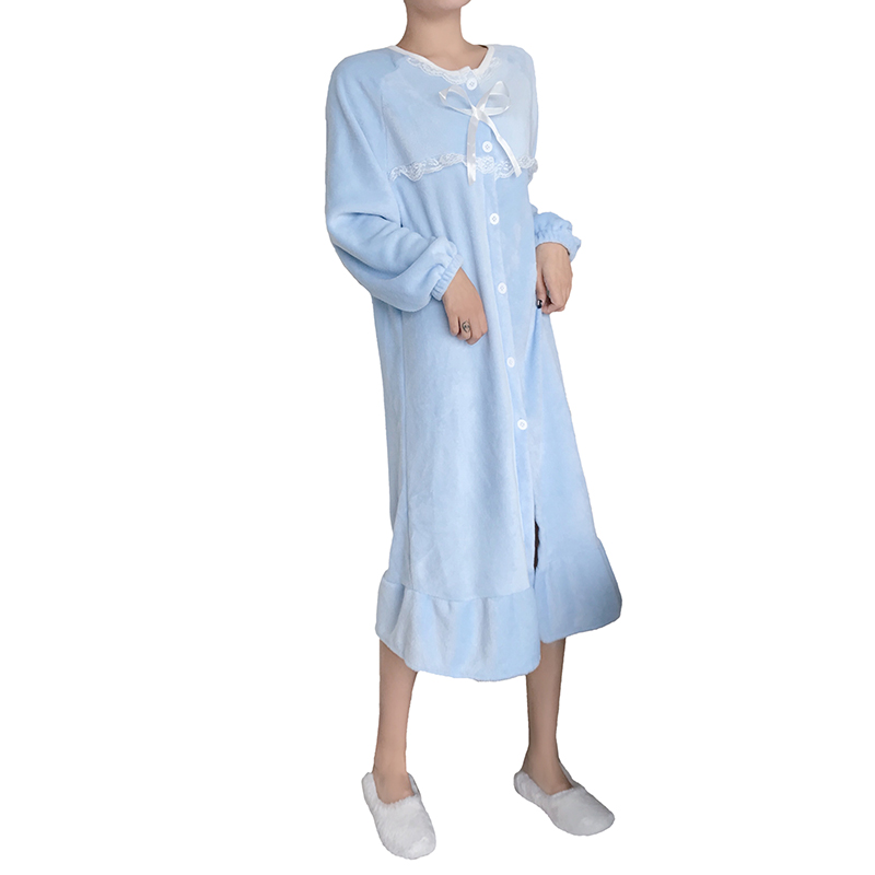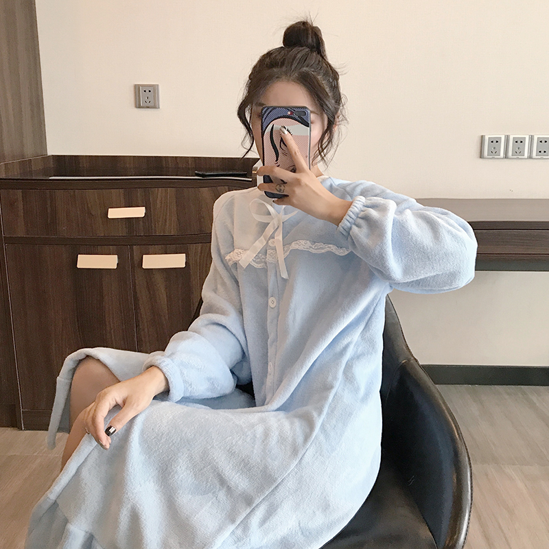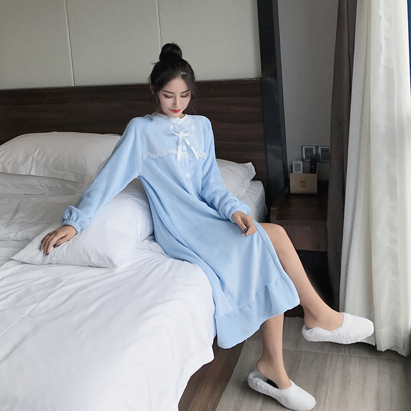 秋裝韓版時尚毛絨絨加厚荷葉邊長袖睡衣連衣裙睡裙家居服女士長裙