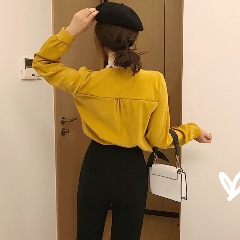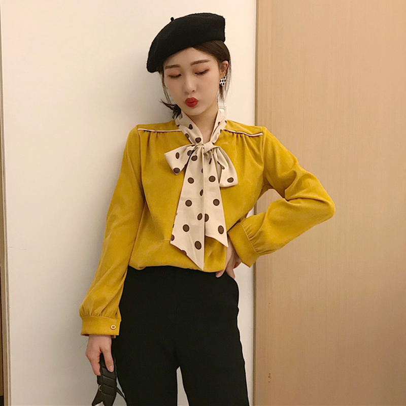 / 時尚波點拼接絲帶襯衣女秋冬裝2018新款韓版氣質寬松長袖襯衫上衣