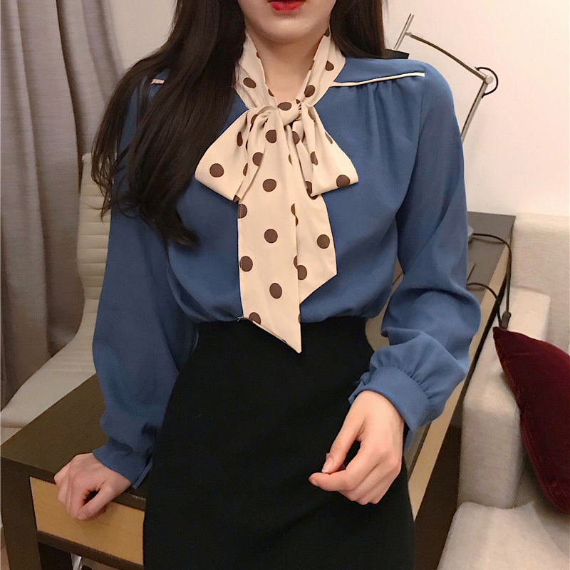 時尚波點拼接絲帶襯衣女秋冬裝2018新款韓版氣質寬松長袖襯衫上衣