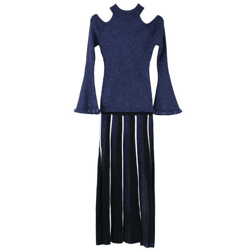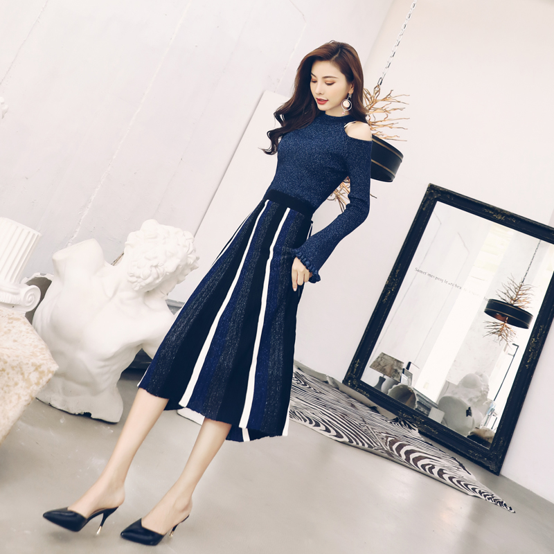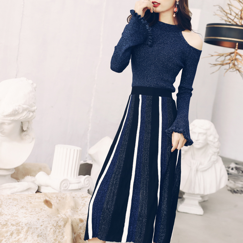 秋裝女2018新款時尚套裝亮絲針織露肩上衣中長款半身裙修身兩件套