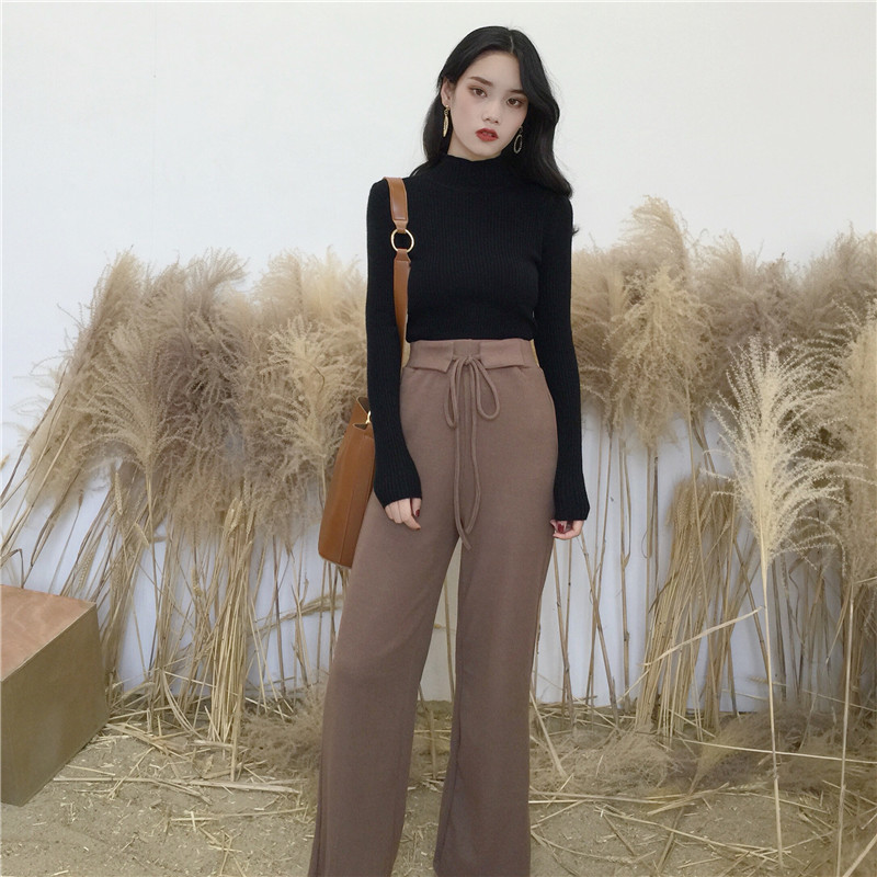 港味女秋裝2018新款復古風修身顯瘦高腰系帶針織直筒百搭闊腿褲潮