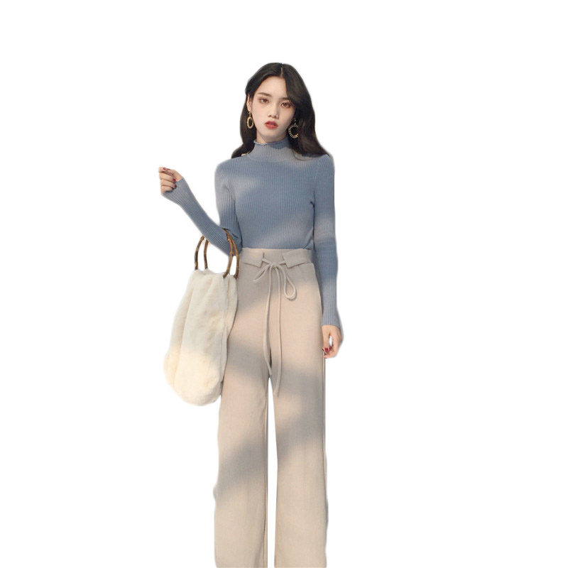 / 港味女秋裝2018新款復古風修身顯瘦高腰系帶針織直筒百搭闊腿褲潮
