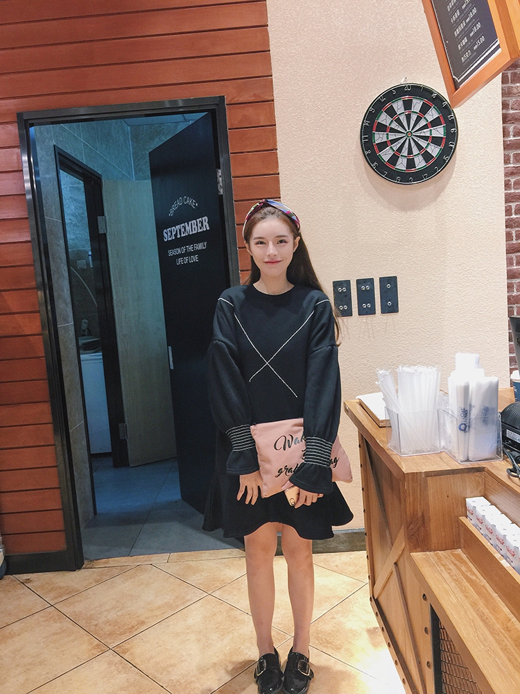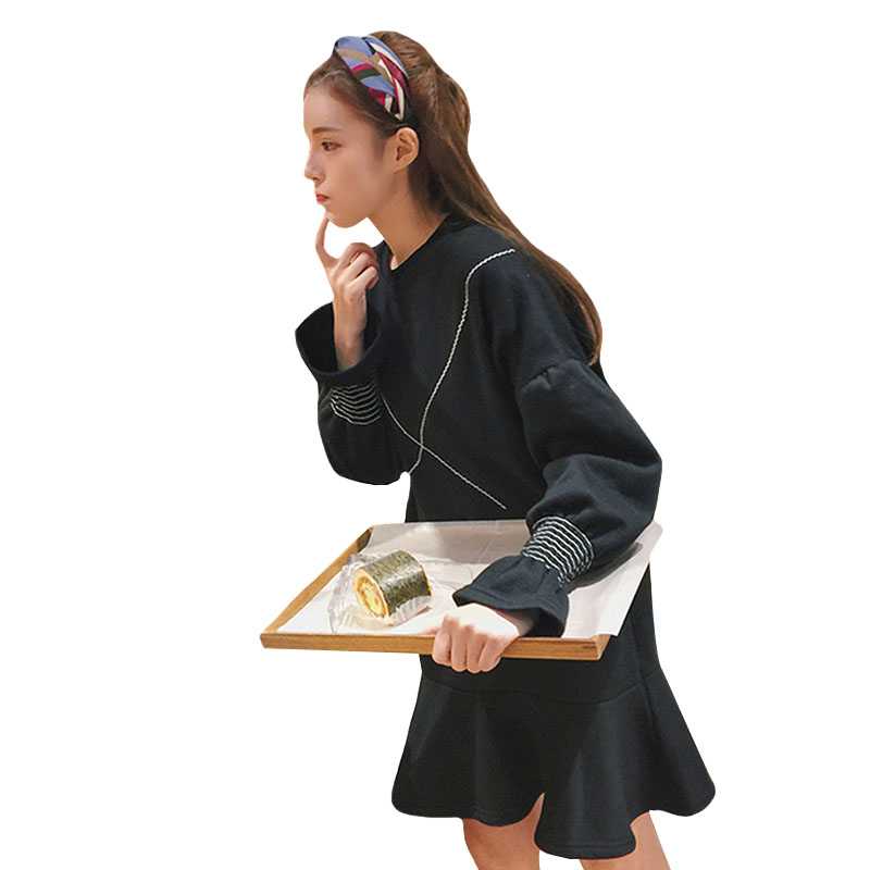 2018新款秋冬韓版chic明線中長款荷葉邊加絨長袖連衣裙學生裙子女