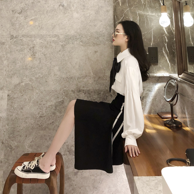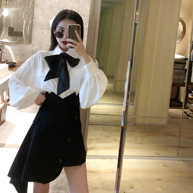 秋裝女2018新款套裝白色領帶燈籠袖襯衫chic+黑色不規則半身裙潮