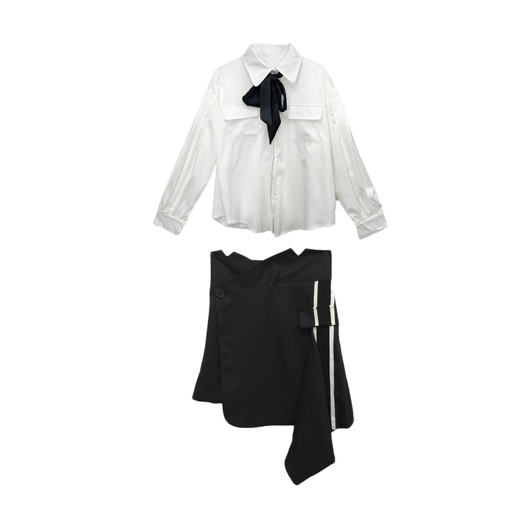 / 秋裝女2018新款套裝白色領帶燈籠袖襯衫chic+黑色不規則半身裙潮