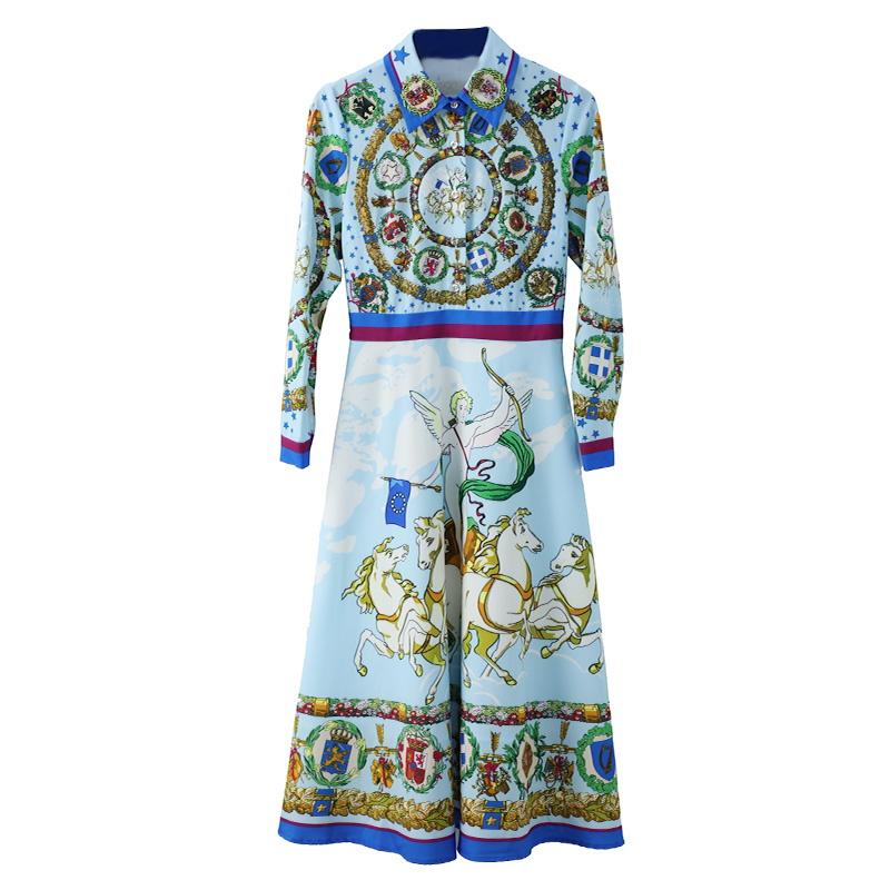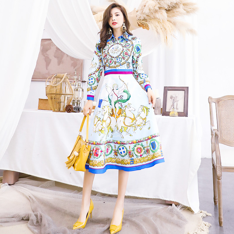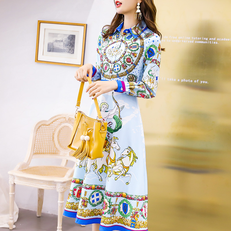 S秀淑女氣質2018秋季新款九分袖高腰印花連衣裙時尚潮