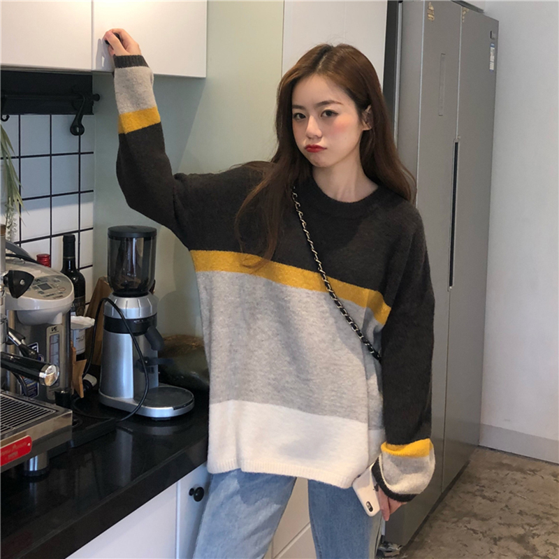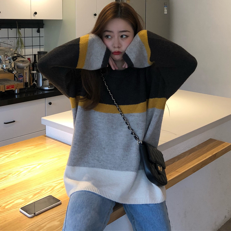 / 撞色條紋慵懶毛衣女秋冬裝2018新款圓領針織外套學生寬松長袖上衣