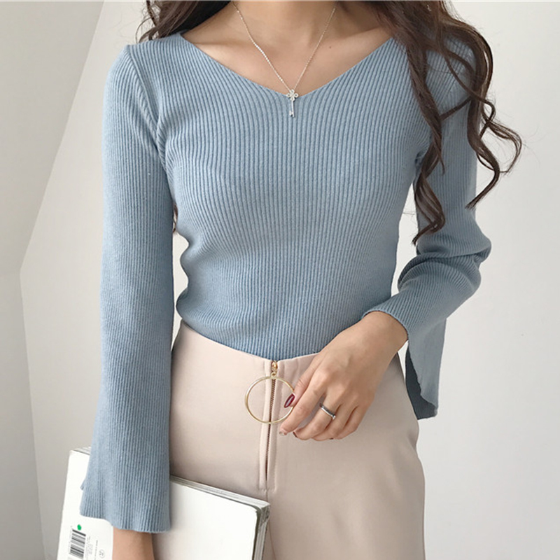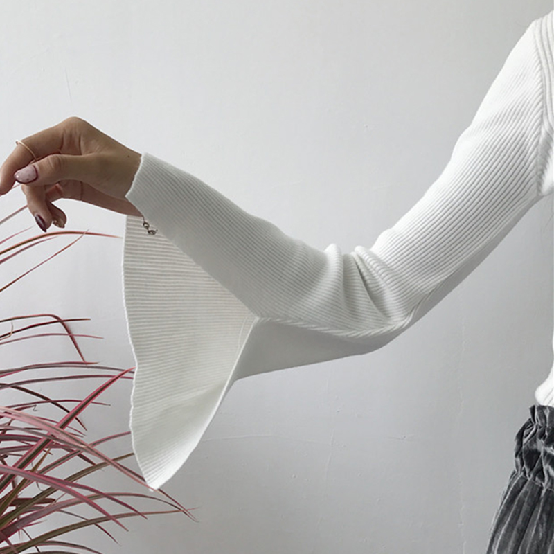 / 秋裝女新款港味復古開叉喇叭長袖針織衫氣質黑色修身打底短款上衣