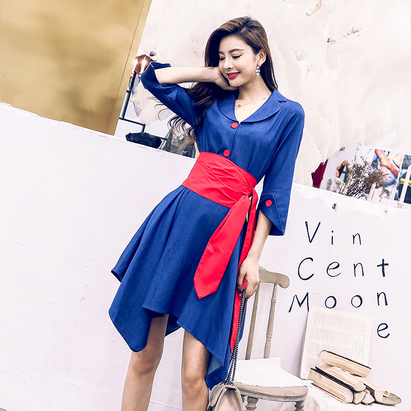 / 名媛2018秋季新款女溫柔風牛仔襯衫兩件套裝不規則氣質連衣裙子潮