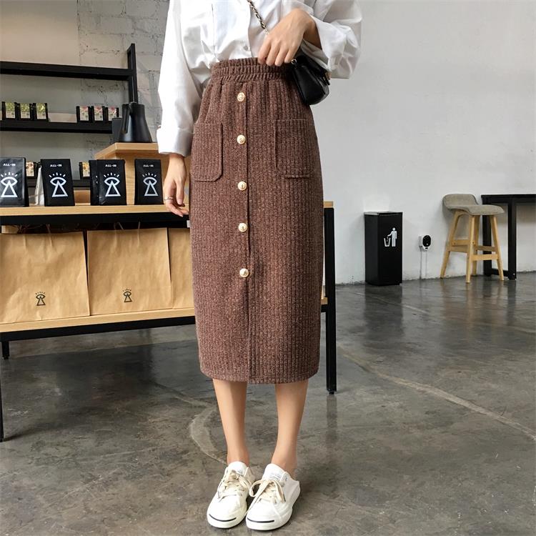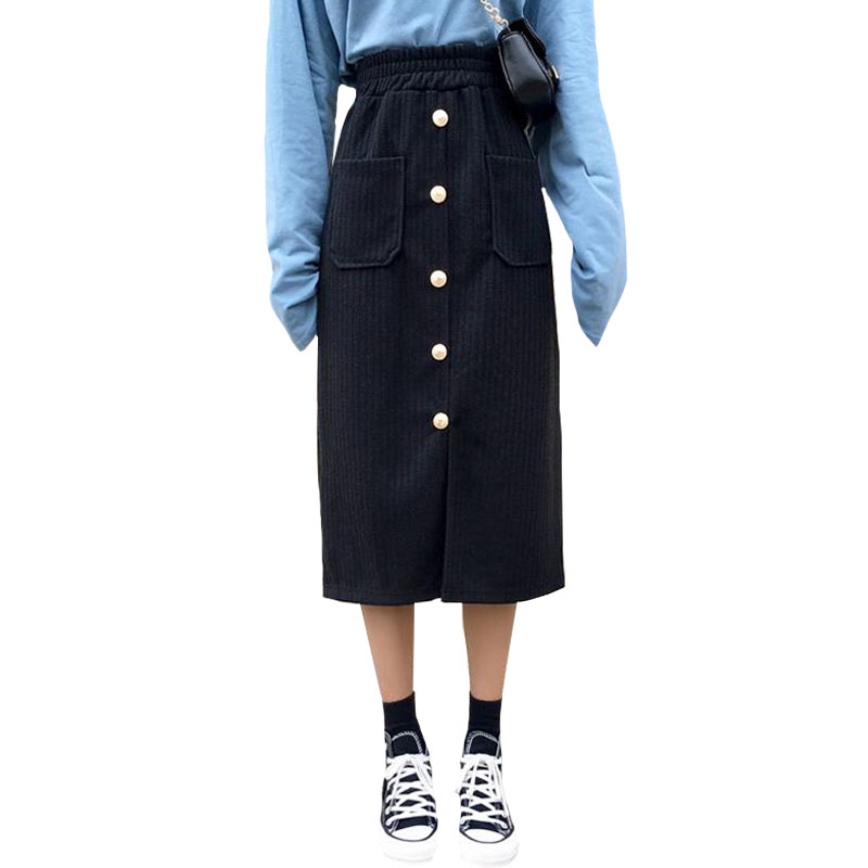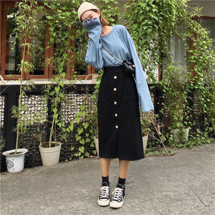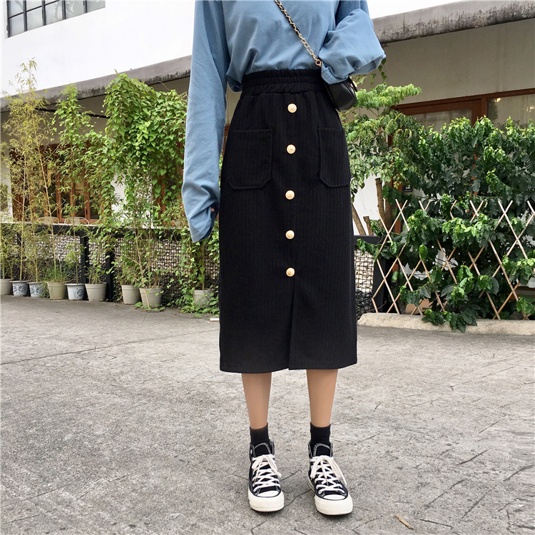 / 秋季女裝韓版高腰開叉顯瘦一排扣裙子松緊腰半身裙A字裙學生長裙