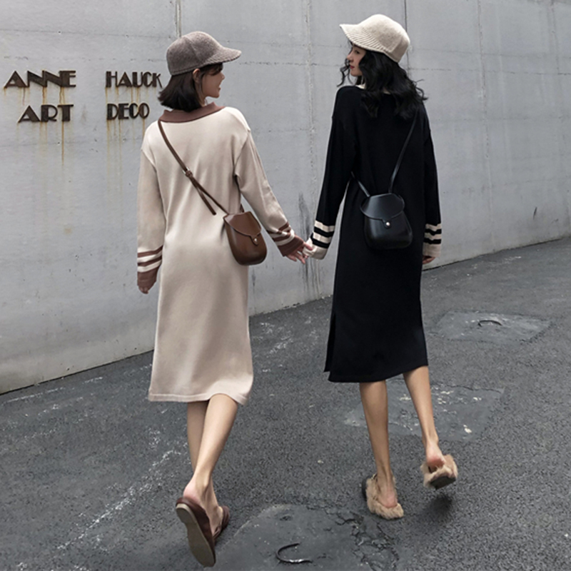 / 拼色翻領針織開叉中長連衣裙子女秋冬裝新款學生egg風法式桔梗裙