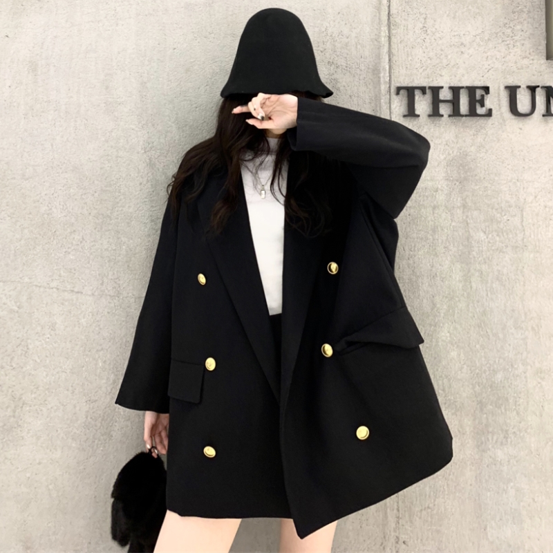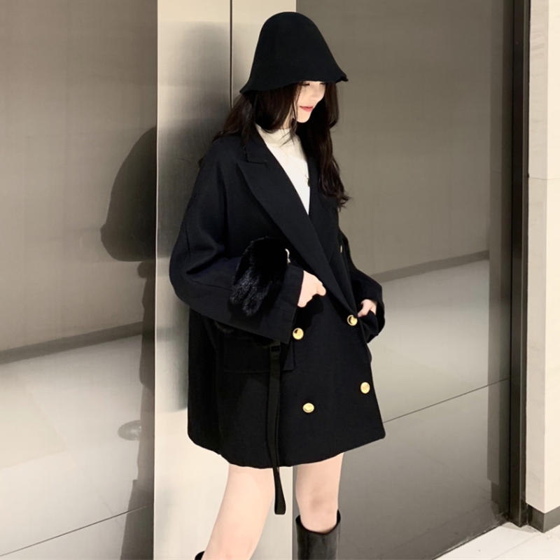 韓國百搭寬松中長款雙排扣中長款毛呢大衣復古西裝領上衣外套女潮