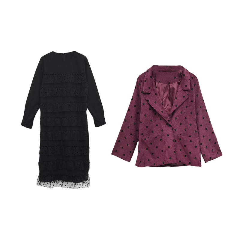 / 女神套裝秋韓國復古風長款波點蕾絲蛋糕連衣裙+修身顯瘦西服外套