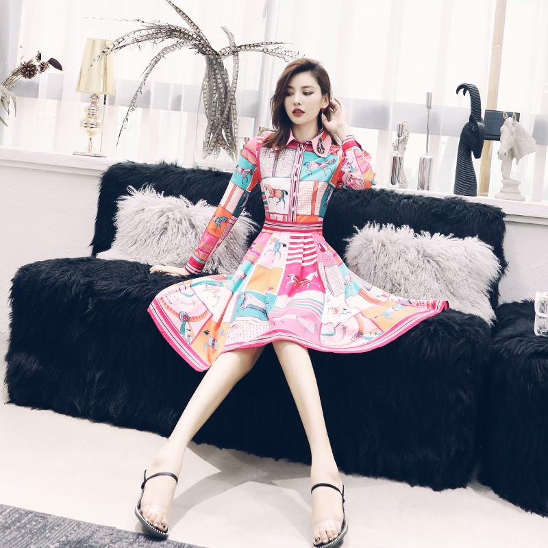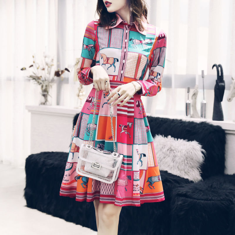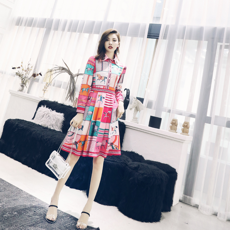 名媛清爽夏季新款2018歐美女裝翻領長袖襯衫復古印花中長款連衣裙
