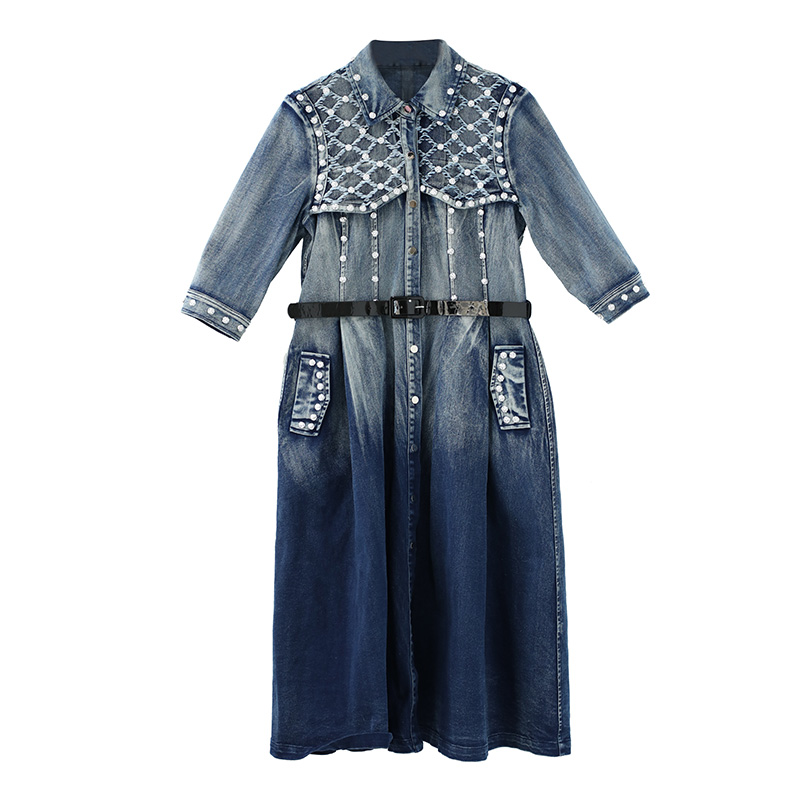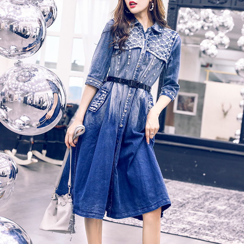 釘珠連衣裙女秋裝秋季2018新款韓版氣質修身收腰顯瘦中袖牛仔長裙