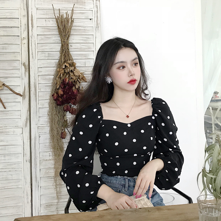 復古法式方領剪裁設計大波點宮廷泡泡袖長袖襯衫時尚氣質上衣女秋