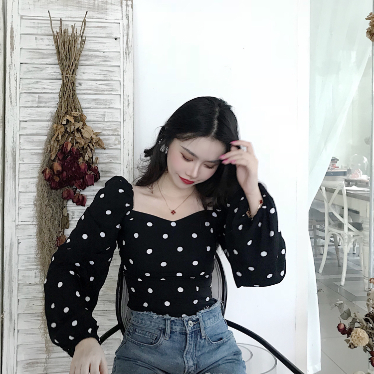 / 復古法式方領剪裁設計大波點宮廷泡泡袖長袖襯衫時尚氣質上衣女秋