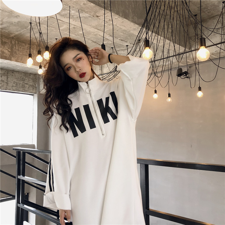 衛衣2018新款女長袖韓版寬松顯瘦oversize印花半高領慵懶長款裙子
