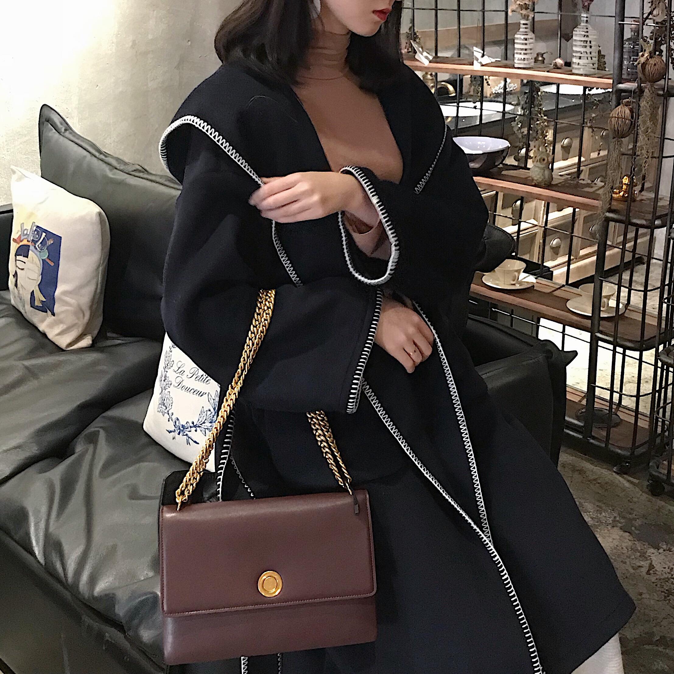 港風外套女冬裝2018新款寬松繡邊連帽系帶中長款毛呢外套大衣女潮