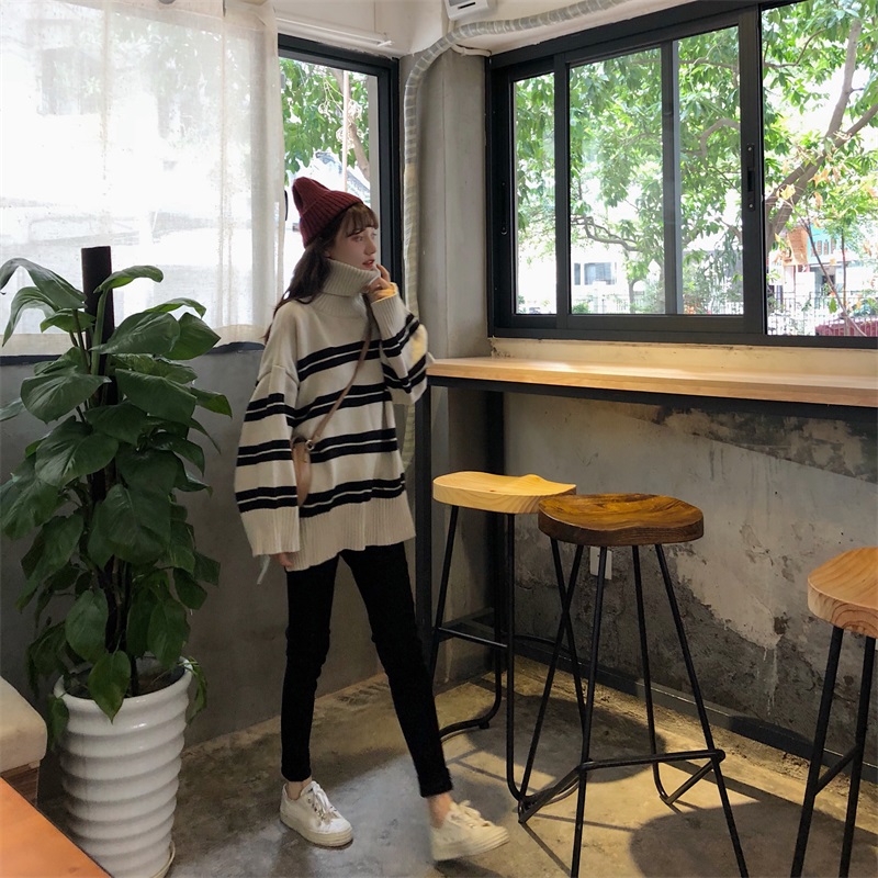 / 韓版修身顯瘦條紋拼色加厚保暖長袖高領打底毛衣女秋冬2018新款潮