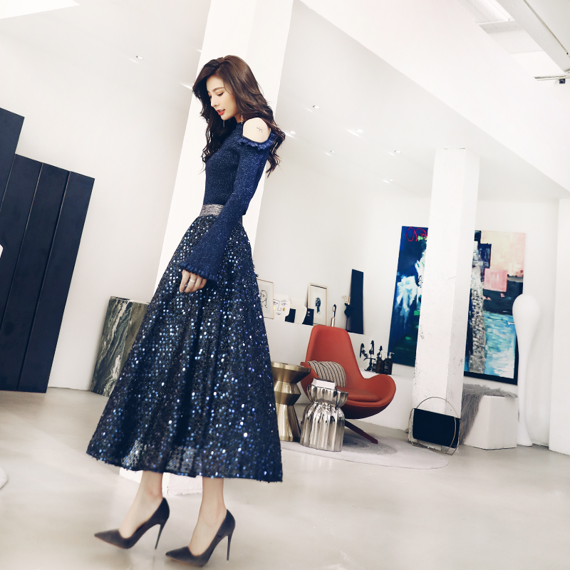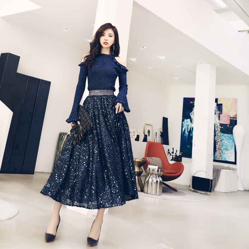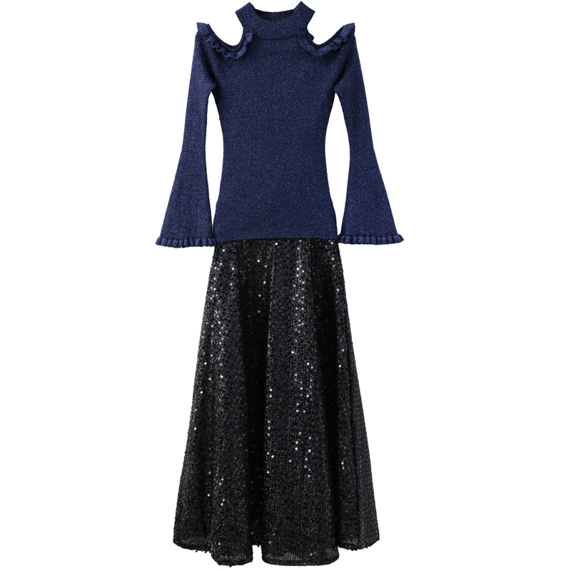 露肩長袖針織衫毛衣半身裙兩件套女2018秋裝新款氣質時尚公主套裝