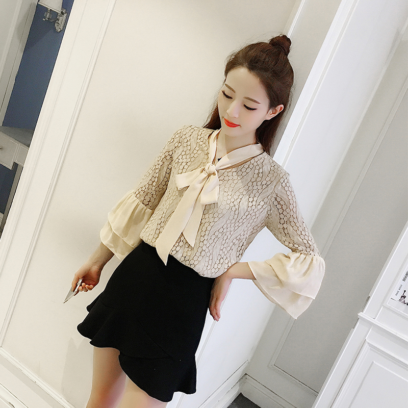 雪紡上衣女春季新款韓版拼接喇叭袖顯瘦百搭V領蕾絲衫打底衫
