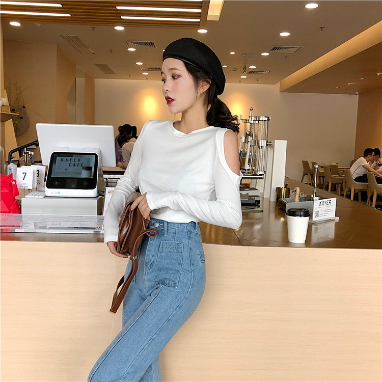 / 上衣女2018新款港味復古小清新顯瘦百搭純色chic韓風露肩長袖T恤